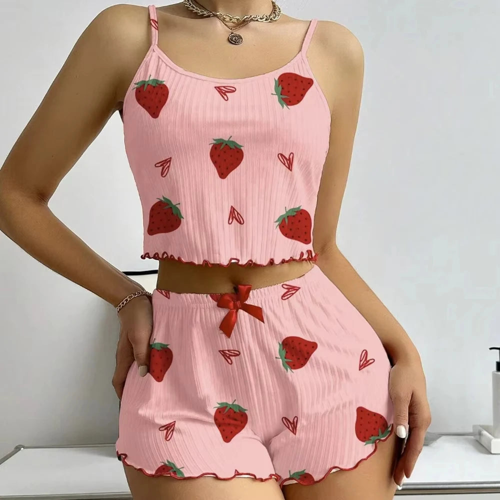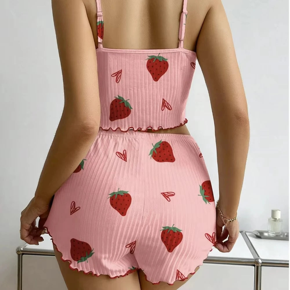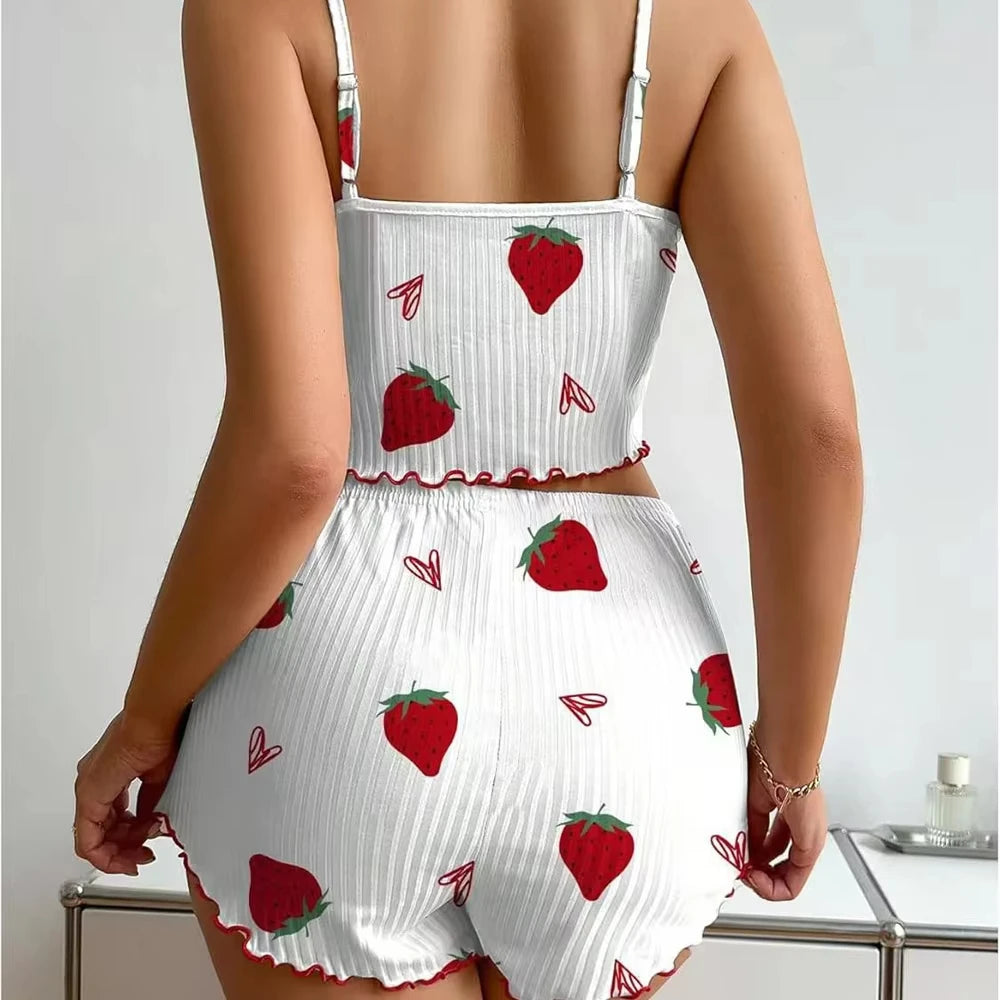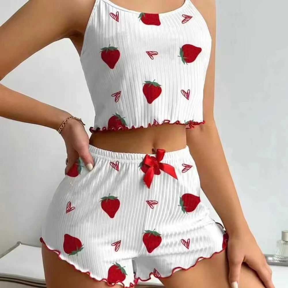 Deze tweedelige pyjama set is een echte must-have voor zomerse nachten. De witte stof is versierd met speelse aardbeienprints die een frisse, vrolijke uitstraling geven. De lichte ribstructuur zorgt voor een zacht reliëf, terwijl de golvende randen aan de zoom een vrouwelijke en charmante touch toevoegen.