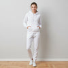 Dit witte dames joggingpak met capuchon combineert eenvoud en stijl voor een frisse, moderne look. De zachte hoodie met kangoeroezak en de comfortabele broek met trekkoord maken het de perfecte keuze voor thuis, sport of een casual dagje uit.