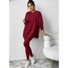 Stijlvolle en comfortabele gebreide set bestaande uit een losse trui met capuchon en een aansluitende broek. De zachte stof en fijne structuur maken het ideaal voor relaxmomenten thuis of casual dagen buiten.