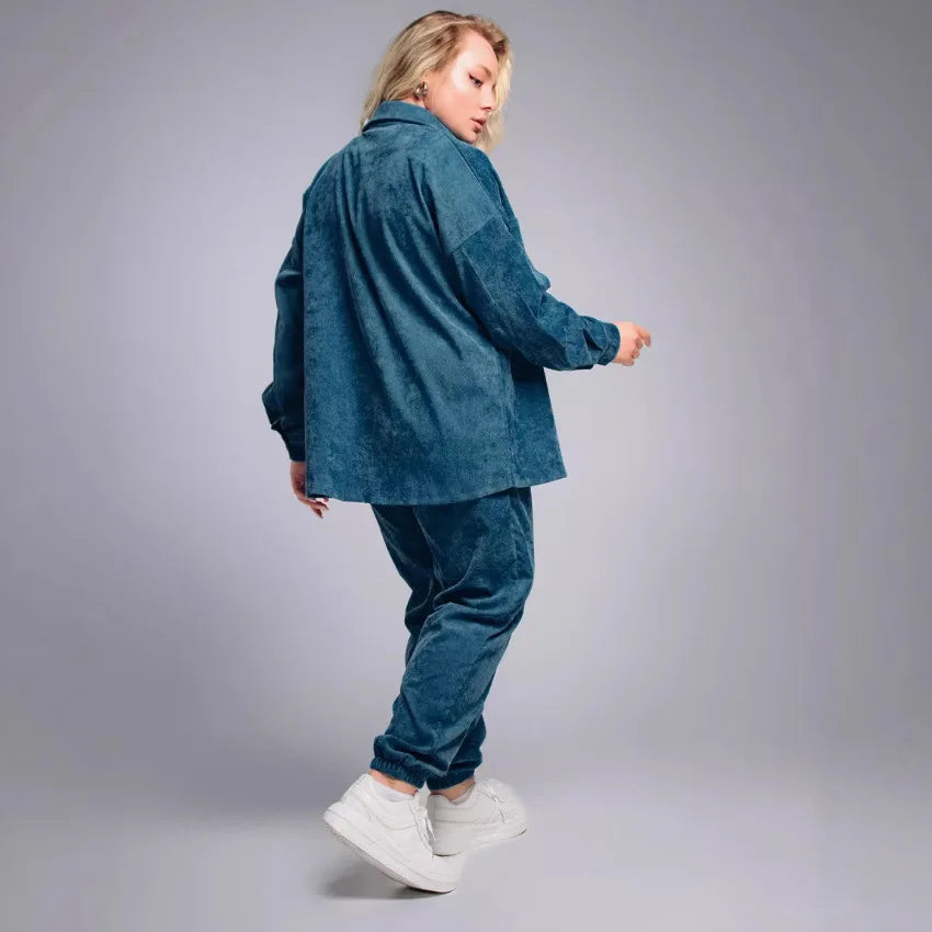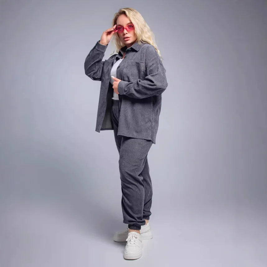 Deze stijlvolle tweedelige set combineert een losse blouse met een comfortabele broek, perfect voor zowel thuis als onderweg. De zachte ribstructuur en het relaxte silhouet geven een trendy maar moeiteloze uitstraling.