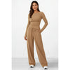 Modern en comfortabel loungepak in een zachte camel kleur. De lange mouwen en wijde broek zorgen voor een elegante en ontspannen uitstraling, ideaal voor thuis of casual uitstapjes.