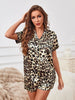 Deze panterprint pyjama set is perfect voor warme zomernachten. De glanzende satijnachtige stof voelt licht en zacht aan op de huid, terwijl de korte mouwen en shorts zorgen voor ultiem comfort. Met zijn elegante kraag, contrasterende biezen en speels pantermotief is deze set zowel stijlvol als comfortabel ideaal om te ontspannen in huis of om in te slapen.
