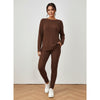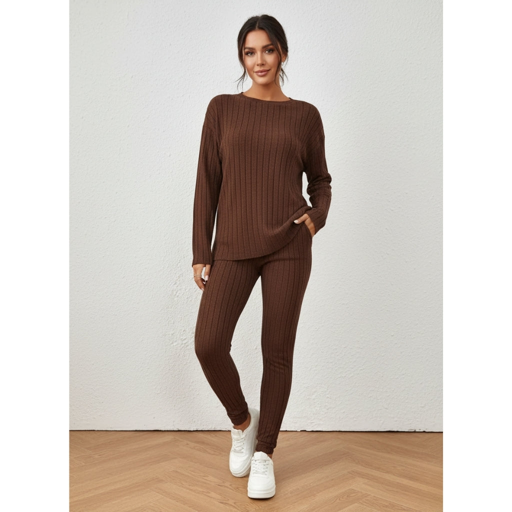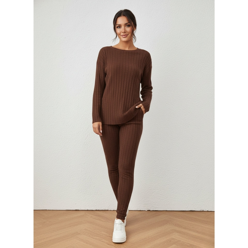 Deze bruine gebreide tweedelige set combineert comfort en stijl in één look. De zachte ribstof voelt aangenaam aan op de huid, terwijl de losse trui en aansluitende broek zorgen voor een elegante, ontspannen uitstraling. Perfect voor cozy dagen thuis of een casual dagje uit.