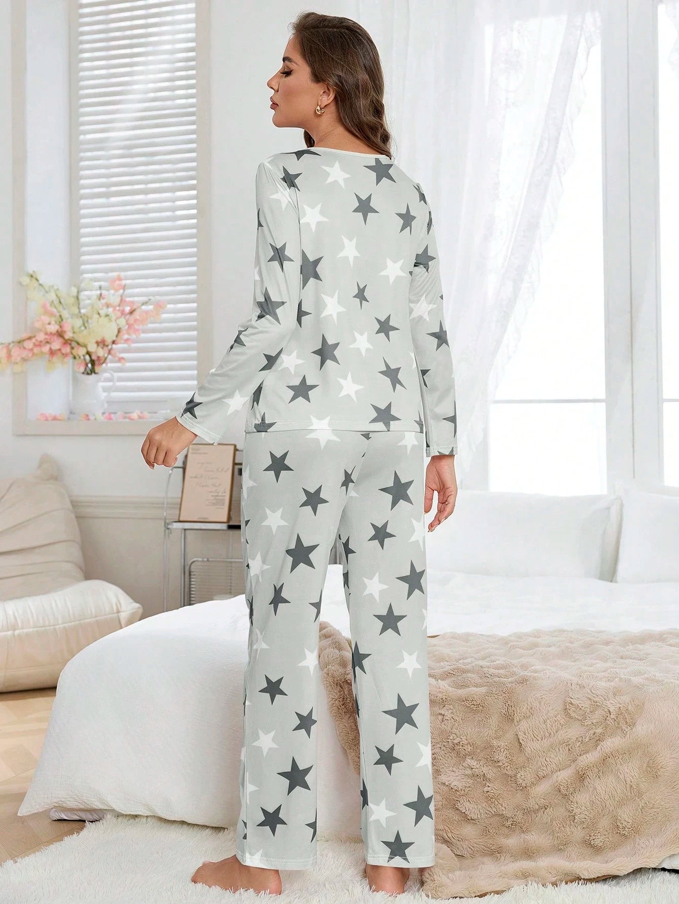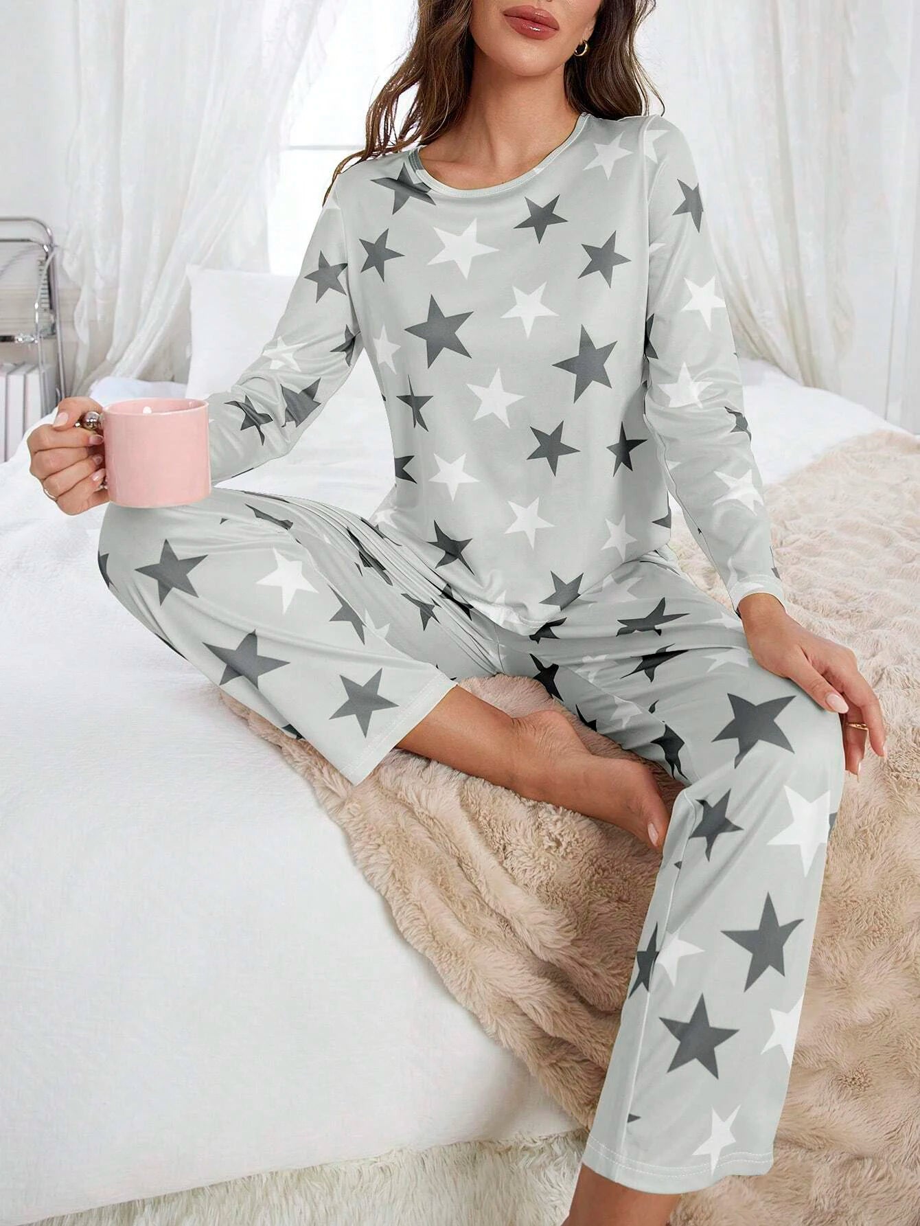 Ontspan in stijl met deze grijze dames pyjama set met sterrenprint, gemaakt van een zachte en rekbare stof die aanvoelt als een tweede huid. De combinatie van comfort en speels design maakt dit de perfecte keuze voor ontspannen avonden thuis.