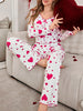 Deze witte dames pyjama set met roze hartjes is perfect voor gezellige avonden en ontspannen ochtenden. De zachte stof voelt comfortabel aan op de huid, terwijl het speelse hartjespatroon een romantische en vrolijke uitstraling geeft.