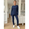 Deze donkerblauwe gebreide tweedelige set biedt de perfecte combinatie van warmte, comfort en stijl. De geribde stof voelt zacht aan en heeft een subtiele stretch voor een flatterende pasvorm. Ideaal voor ontspannen dagen thuis of een casual dagje uit.