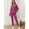 Trendy en comfortabele gebreide set bestaande uit een losse trui en een aansluitende broek. De zachte ribstof zorgt voor een aangenaam draaggevoel, ideaal voor cozy dagen thuis of een casual look buitenshuis.
