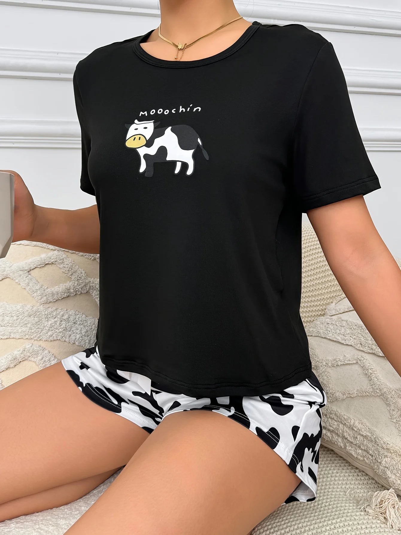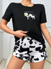 Deze leuke tweedelige set combineert comfort met een speels design. De zwarte top met een schattige koeprint en de bijpassende short met koeienvlekken zorgen voor een originele en comfortabele look perfect voor zomerse dagen of relaxmomenten thuis.