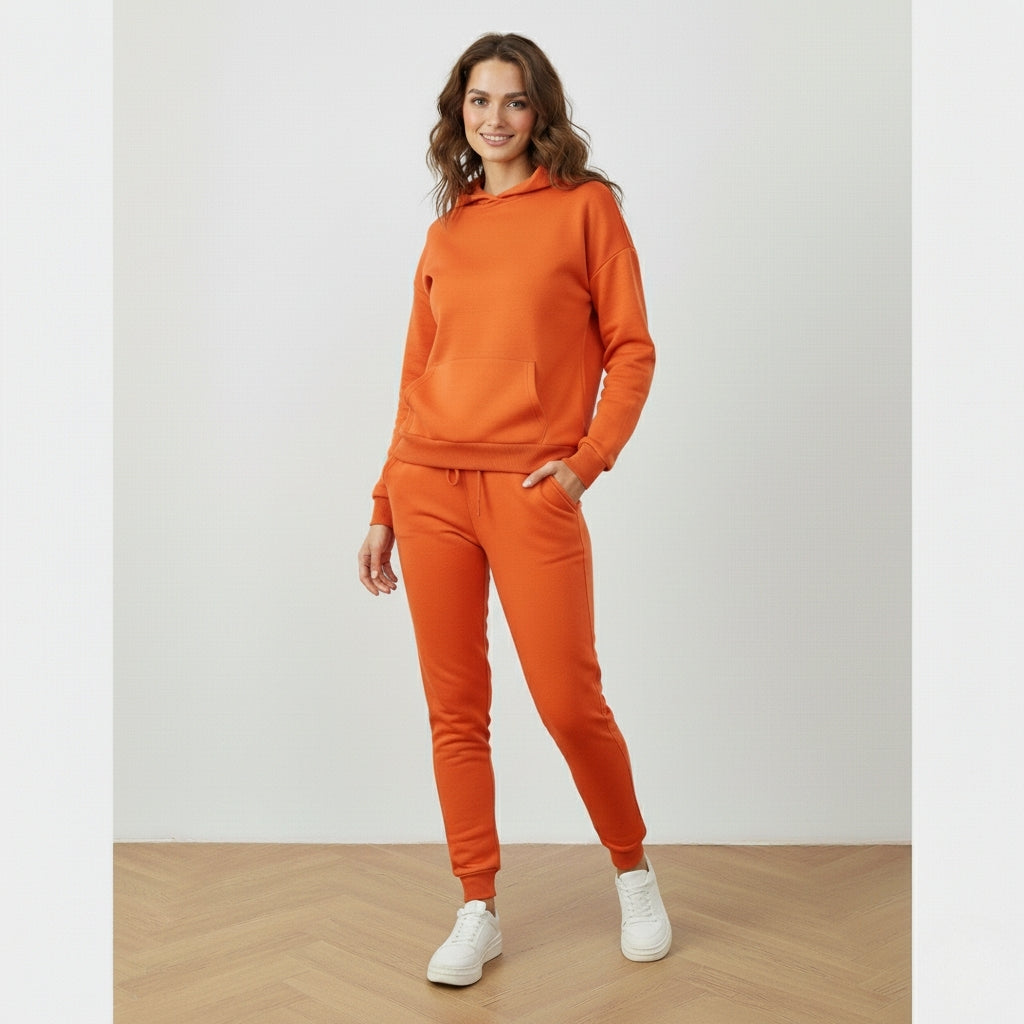Voeg kleur en energie toe aan je outfit met dit oranje dames joggingpak met capuchon. De zachte hoodie met kangoeroezak en bijpassende broek met trekkoord zorgen voor een sportieve, moderne uitstraling. Perfect voor thuis, sport of een casual dagje uit.