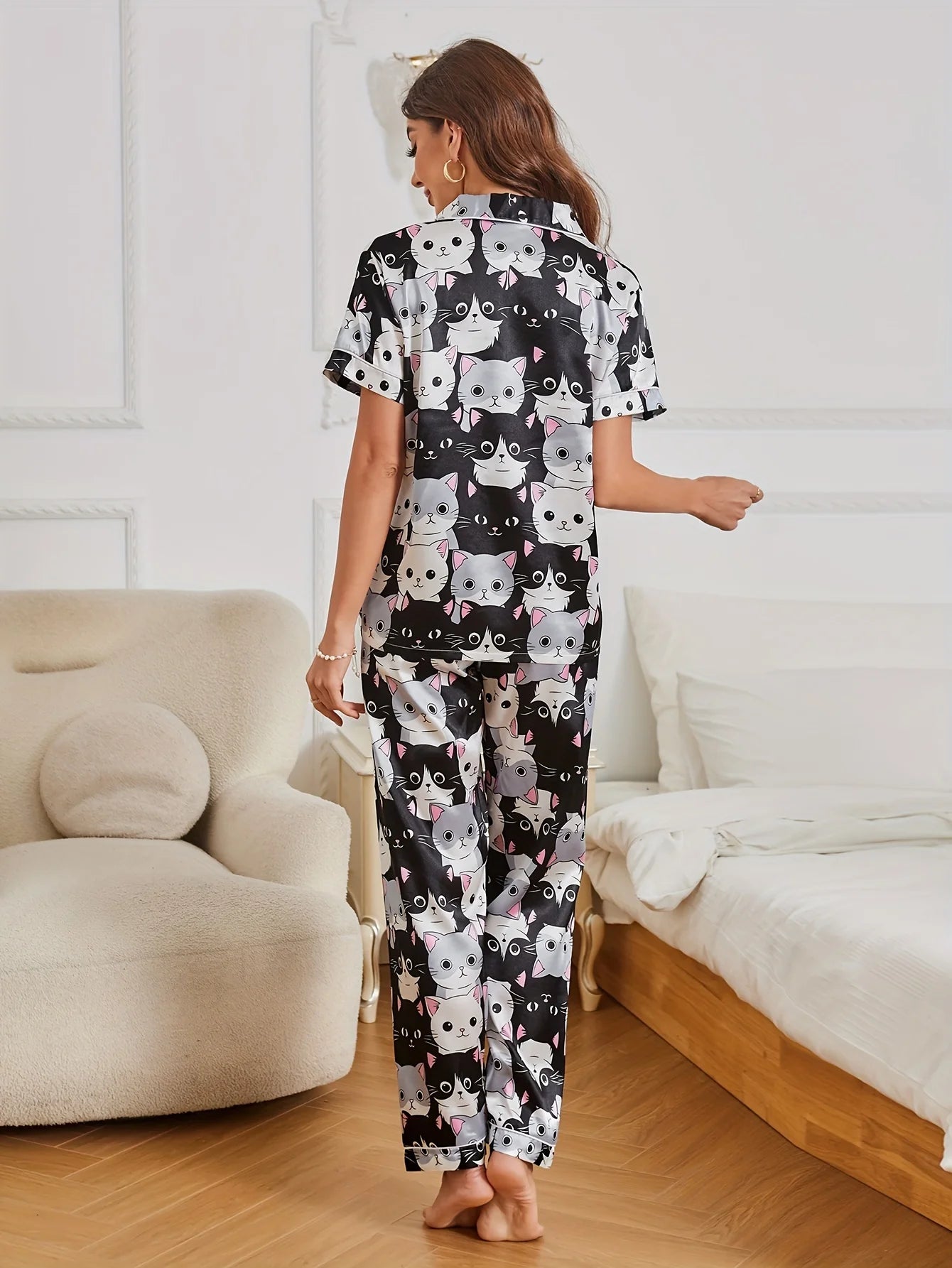 Unieke tweedelige set met schattige kattenprint, ideaal voor ontspanning of rustige avonden thuis. De gladde satijnstof voelt zacht aan op de huid en biedt optimaal comfort.