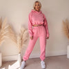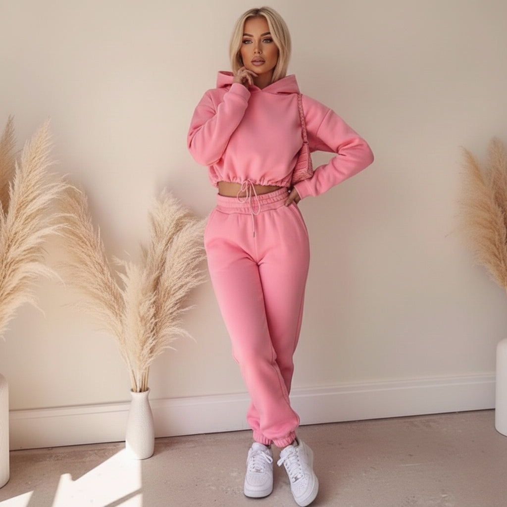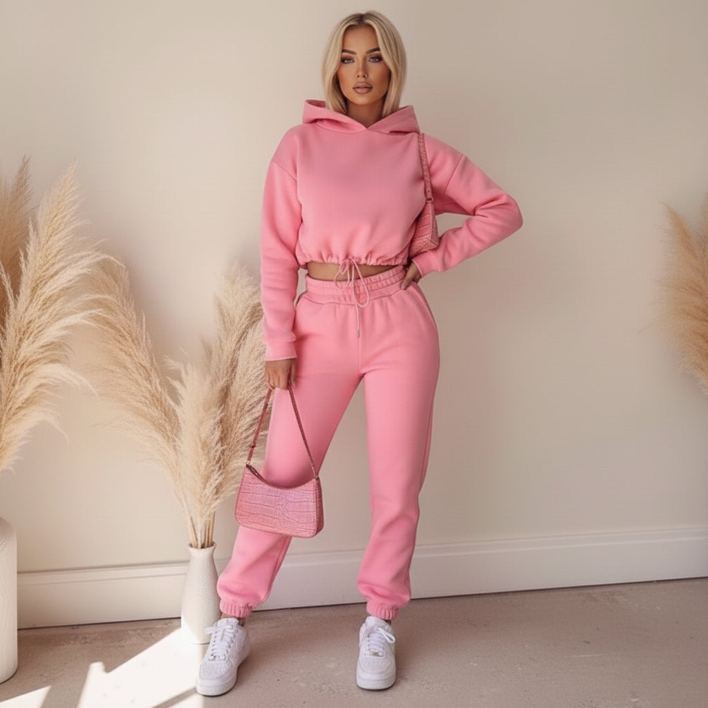 Voeg een vleugje kleur toe aan je casual garderobe met dit roze joggingpak voor dames. De zachte stof, cropped hoodie en comfortabele broek creëren een trendy look die perfect is voor zowel thuis als onderweg.