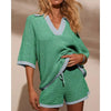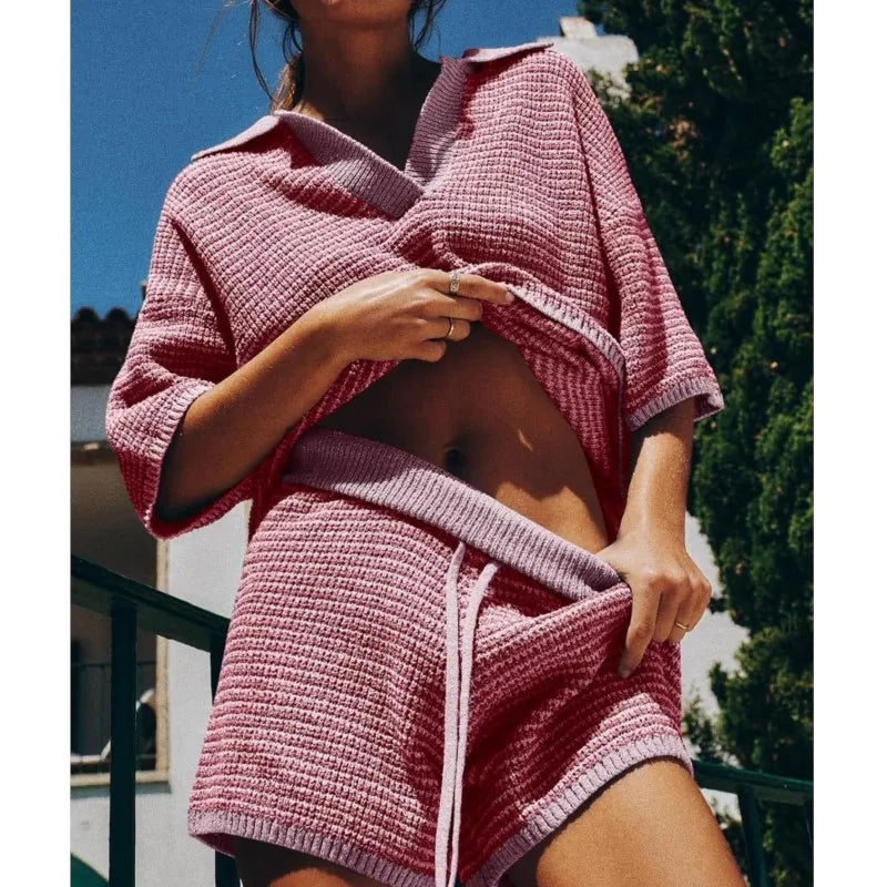 Deze stijlvolle tweedelige set combineert comfort en elegantie met een vleugje retro. De groene knitstof met lichtblauwe accenten zorgt voor een frisse en moderne look. Dankzij de losse pasvorm, de kraag en het korte broekje is deze set ideaal voor lente- en zomerdagen zowel casual als chic te dragen.
