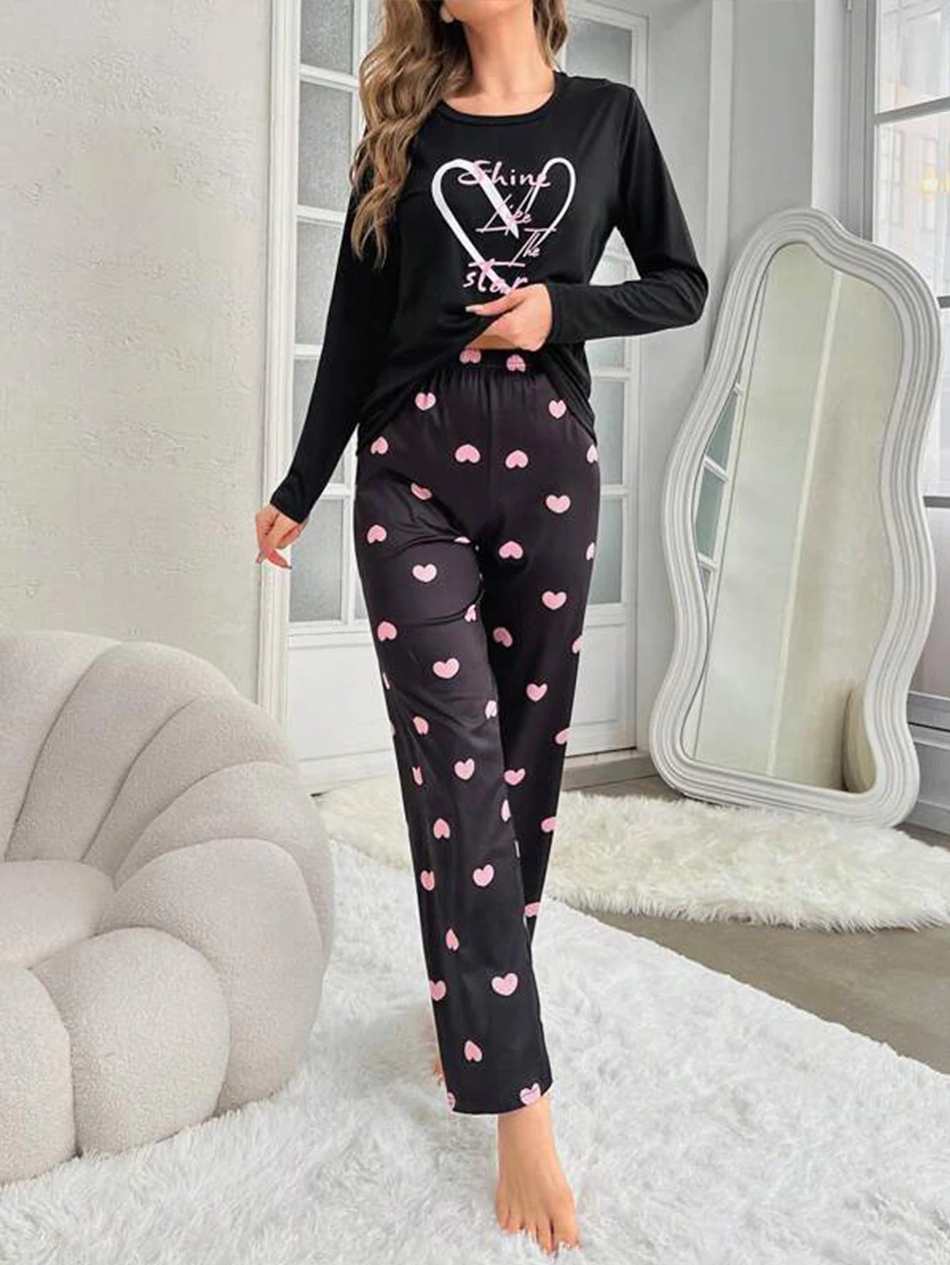 Deze zwarte pyjama met roze hartjes combineert comfort en een schattige look voor gezellige avonden thuis. De lange mouwen en de zachte stof zorgen voor een aangenaam gevoel op de huid. De broek met elastische tailleband heeft een speels hartjespatroon, wat zorgt voor een romantische en stijlvolle uitstraling.
